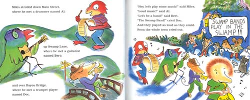 ÁÖÀΰø Miles´Â »ýÀÏ ¼±¹°·Î »ö¼ÒÆùÀ» ¹Þ¾Ò½À´Ï´Ù. óÀ½ ºÒ¾îº¸´Ï ¾öû ½Ã²ô·¯¿î ¼Ò¸®°¡ ³µÁö¿ä. ¹ã³·À¸·Î ¿¬½ÀÀ» ÇÏÀÚ ¾î¸Ó´Ï°¡ ¹ÛÀ¸·Î ³ª°¡¼ Ç϶ó°í ÂѾƳÀ´Ï´Ù. ±×·¯ÀÚ ÀÌÁ¦ ¿Â °Å¸®¿¡¼ ½Ã²ô·´´Ù°í ³¸®°¡ ³ª³×¿ä. ¿¬½ÀÀ» ÇÏ´Ù°¡ ´Ù¸¥ ¾Ç±â¸¦ ´Ù·ç´Â ¸â¹öµéÀ» ¸¸³ª ¹êµå¸¦ ¸¸µé¾úÁö¿ä. The Swamp Band' ½Ã²ô·¯¿ö °ßµô ¼ö ¾ø°Ô µÈ »ç¶÷µéÀÌ Swamp/´ËÁö¿¡ °¡¼ ¿¬ÁÖÇ϶ó°í ÂѾƳ»Áö¿ä. ±×·¯´Ù°¡ ¾Ç¾îµéÀÇ ÆÄƼ¿¡ ÃÊ´ë¹Þ°Ô µÇ°í ±×µéÀÇ ¸®¹öº¸Æ®¿¡¼ ¿¬ÁÖ¸¦ ÇÏ°Ô µË´Ï´Ù. ±×µéÀº ¿À·£¸¸¿¡ ½Å³ª°Ô ¿¬ÁÖÇÏ°í ¾Ç¾îµéÀº ¶Ç ½Å³ª°Ô ÃãÃß°í ³î¾Ò½À´Ï´Ù. ÇÑÂü ³î´Ùº¸´Ï ¹è°¡ °íÆÄÁø ¾Ç¾îµé, ±×µéÀÇ ¸Þ´º¿£ ¡®Swamp Band soup!'ÀÌ ¿Ã¶ó¿Í ÀÖ½À´Ï´Ù. ±×¾ß¸»·Î Àú³á¹äÀÌ µÉ À§±â¿¡ ³õÀÎ ¹êµå ¸â¹öµé. ¾î¶»°Ô ÇØ¼ ÀÌ À§±â¸¦ ¹þ¾î³¯±î¿ä? ¸¶Áö¸· °îÀ¸·Î ÀÚÀå°¡¸¦ ¿¬ÁÖÇÏ¿© ¸ðµç ¾Ç¾î¸¦ ÀáÀç¿ì°í ¹«»çÈ÷ Å»Ãâ ÇÕ´Ï´Ù. Á¶¿ëÈ÷ ¿¬ÁÖÇÏ¸é¼ ¿À´Â Miles¸¦ º» ¾î¸Ó´Ï ±×Á¦¼¾ß ¡®How nice....'ÇϽʴϴÙ. ¿ì¸®´Â ÀÌ Ã¥À» ÅëÇØ¼ ¾î·Á¿òÀ» ½½±â·Ó°Ô ±Øº¹ÇÔÀ¸·Î¼ ÁöÇý°¡ »ý±ä´Ù´Â °ÍÀ» ¾Ë°Ô µË´Ï´Ù.