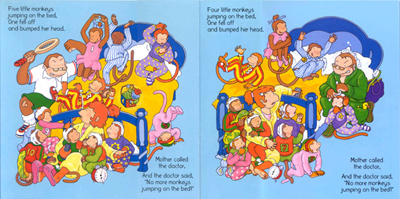 ³Î¸® ¾Ë·ÁÁ® ÀÖ´Â Àü·¡µ¿¿ä 'Ten Little Monkeys Jumping on the Bed'¸¦ ³»¿ëÀ¸·Î ¾´ Ã¥ÀÔ´Ï´Ù. ¿ ¸¶¸®ÀÇ °³±¸ÀïÀÌ ¿ø¼þÀ̵éÀÌ Ä§´ë À§¿¡¼ Á¤½Å¾øÀÌ ¶Ù°í ÀÖ½À´Ï´Ù. ±×·¯´Ù ÇÑ ¸¶¸®°¡ ¶³¾îÁö°í ¹Ù´Ú¿¡ ¸Ó¸®¸¦ ¡®Äô¡¯¹ÚÁö¿ä. ³î¶õ ¾ö¸¶ ¿ø¼þÀ̰¡ ÀÇ»ç ¼±»ý´ÔÀ» ºÎ¸£°í, ÀÇ»ç ¼±»ý´ÔÀº ħ´ë¿¡¼ ´õ ÀÌ»ó ¶ÙÁö ¸»¶ó°í ÇϽʴϴÙ. ¸Ó¸®¸¦ ´ÙÄ£ ¿ø¼þÀ̰¡ ¸Ó¸®¸¦ ½Î¸Å°í ¾É¾ÆÀÖÁö¸¸ ³ª¸ÓÁö ¾ÆÈ© ¸¶¸® ¿ø¼þÀÌ´Â ¾Æ¶û°÷ÇÏÁö ¾Ê°í ´Ù½Ã ħ´ë¿¡¼ ¶Ù°í, ±× Áß ÇÑ ³à¼®ÀÌ ¶Ç ¶³¾îÁ® ¸Ó¸®¸¦ ´ÙĨ´Ï´Ù. ÀÌ·¸°Ô ÇÑ ¸¶¸®¾¿ ħ´ë¿¡¼ ¶³¾îÁö°í Â÷·Ê·Î ¸Ó¸®¸¦ ´ÙÄ¡°Ô µË´Ï´Ù. ¿ ¸¶¸® ¿ø¼þÀ̵éÀÌ ÀÔ°í ÀÖ´Â ¿Ê¿¡´Â 1ºÎÅÍ 10±îÁö ¼ýÀÚ°¡ ¾²¿©ÀÖ¾î Çϳª¾¿ ¼ö¸¦ ¼¼¸ç ³ë·¡¸¦ ºÎ¸¦ ¼ö ÀÖ½À´Ï´Ù. ¶ÇÇÑ Ã¥ À帶´Ù ±¸¸ÛÀÌ ¶Õ·ÁÀÖ¾î Ã¥À» º¸´Â Àç¹Ì¸¦ ´À³¥ ¼ö ÀÖÀ¸¸ç, ÀåÀ» ³Ñ±æ ¶§ ¸¶´Ù ¶Õ¸° ±¸¸ÛÀ¸·Î º¸ÀÌ´Â ¾ö¸¶ ¿ø¼þÀÌ¿Í ÀÇ»ç ¼±»ý´ÔÀÇ Ç¥Á¤ º¯È ¿ª½Ã º¸´Â À̸¦ ¿ôÀ½Áþ°Ô ÇÕ´Ï´Ù. ¼ýÀÚ¿¡ ´ëÇÑ °³³äÀ» ³ë·¡¸¦ ÅëÇØ ÀÚ¿¬½º·´°Ô ÀÍÈú ¼ö ÀÖÀ¸¸ç, ³ë·¡¿¡ ¸ÂÃç µ¿ÀÛÀ» ÇÏ¸é ´õ¿í ½Å³ª°Ô ³ë·¡¸¦ ºÎ¸¦ ¼ö ÀÖ½À´Ï´Ù. |