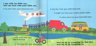 ÀÌ Ã¥Àº ÀÛ°¡°¡ Á÷Á¢ ¿°»öÇÑ ¹àÀº »ö°¨ÀÇ Ãµ¿¡´Ù ÇѶ¡ ÇѶ¡ ¼ÕÀ¸·Î ¹Ù´ÀÁúÇÑ »ðȸ¸À¸·Îµµ ³î¶ó¿òÀ» °¨Ãß±â ¾î·Æ½À´Ï´Ù. ¶ÇÇÑ I spy with my little eye, (³» ÀÛÀº ´«À¸·Î ã¾Æº¼°Ô) You can hear with your little ear. (³Í ÀÛÀº ±Í·Î µé¾îº¸·Å.)ÀÇ ¹Ýº¹µÇ´Â ´Ü¼øÇÑ ¹®Àå°ú Á¡ÁõÀûÀÎ transportationÀÇ Á¶È°¡ ¾î»öÇÏÁö ¾Ê°Ô Àü°³µÇ°í ÀÖ½À´Ï´Ù.