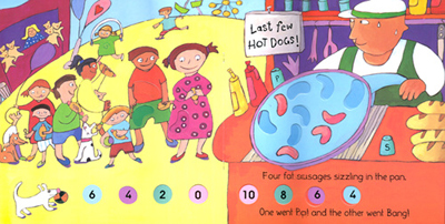 Ã¥ Ç¥Áö¸¦ º¸¸é °ÀÌÁö µéÀÌ ¼Ò½ÃÁö¸¦ ¸ÔÀ»·Á°í ¾È´ÞÀ̳׿ä. ¼Ò½ÃÁö´Â ¾î¸¥, ¾ÆÀÌ, °¾ÆÁö ¸ðµÎ ÁÁ¾ÆÇÏ´Â À½½ÄÀÌÁÒ. ÀÌ ¸ÀÀÖ´Â ¼Ò½ÃÁö°¡ ³ë·¡ ¼Ó¿¡ ´ã°Ü ÀÖ´ä´Ï´Ù. Ã¥ ¼Ó¿¡ ¶Õ¸° ±¸¸Û(die-cutÀ̶ó°í ºÎ¸£ÁÒ)À» º¸¸é 10°³¿¡¼ ½ÃÀÛÇØ¼ µÎ °³¾¿ ¼Ò½ÃÁö°¡ ÆÈ¸± ¶§¸¶´Ù ±¸¸ÛÀÌ ´Ã¾î³ª¸é¼ ³²¾Æ ÀÖ´Â ¼ýÀÚ¸¦ º¸¿©ÁÝ´Ï´Ù. 10, 8, 6, 4, 2, 0 ÀÌ·± ½ÄÀ¸·Î 10¿¡¼ Ãâ¹ßÇØ¼ count backward µË´Ï´Ù.